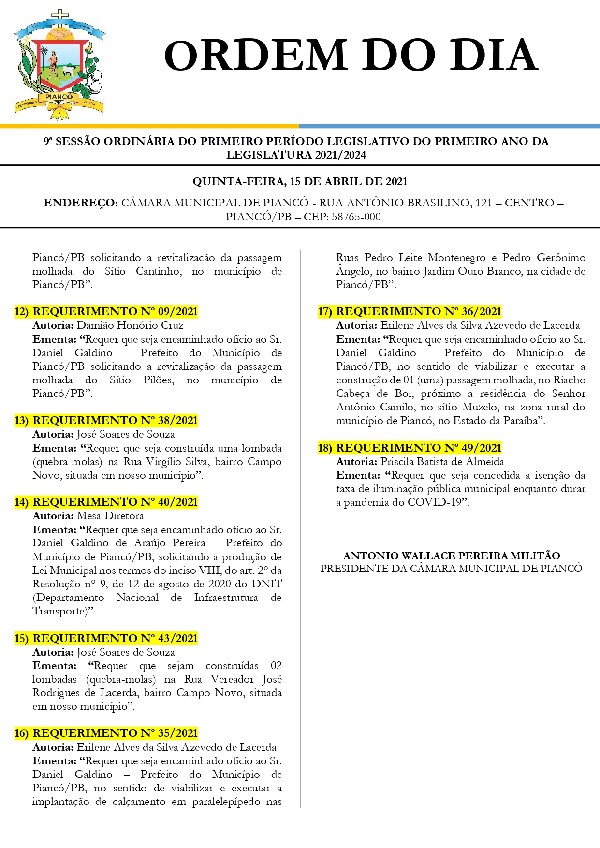 ORDEM DO DIA DA 9ª SESSÃO ORDINÁRIA DO PRIMEIRO PERÍODO LEGISLATIVO DO PRIMEIRO ANO DA LEGISLATURA 2021/2024, QUE SERÁ REALIZADA NO DIA 15 DE ABRIL DE 2021, ÀS 19h, NA SEDE DA CÂMARA MUNICIPAL DE PIANCÓ/PB.